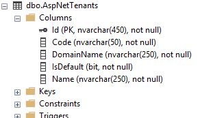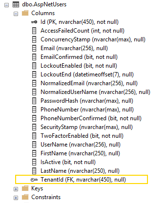 Also, looking at the AspNetUsers table, we can also find our foreign key back to our AspNetTenants table.