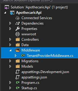 Now it’s time to write some .Net Core middleware. I have added a folder called “Middleware” and a class in that new folder called “TenantProviderMiddleware”.