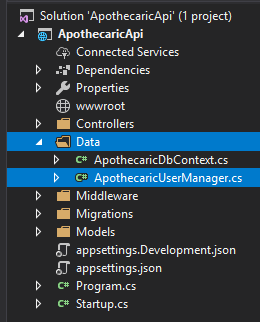 We then need to go back (again!) to our Startup class and register our new ApothecaricUserManger with the Identity middleware. Find our AddIentity call in the ConfigureServices method and add on the AddUserManger registration.