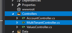 The last step here is to create a base Controller class and have our Controller’s inherit from a new MultiTenantController instead of the built-in Controller class. Create a new controller named “MultiTenantController” and add that to the Controllers folder.
