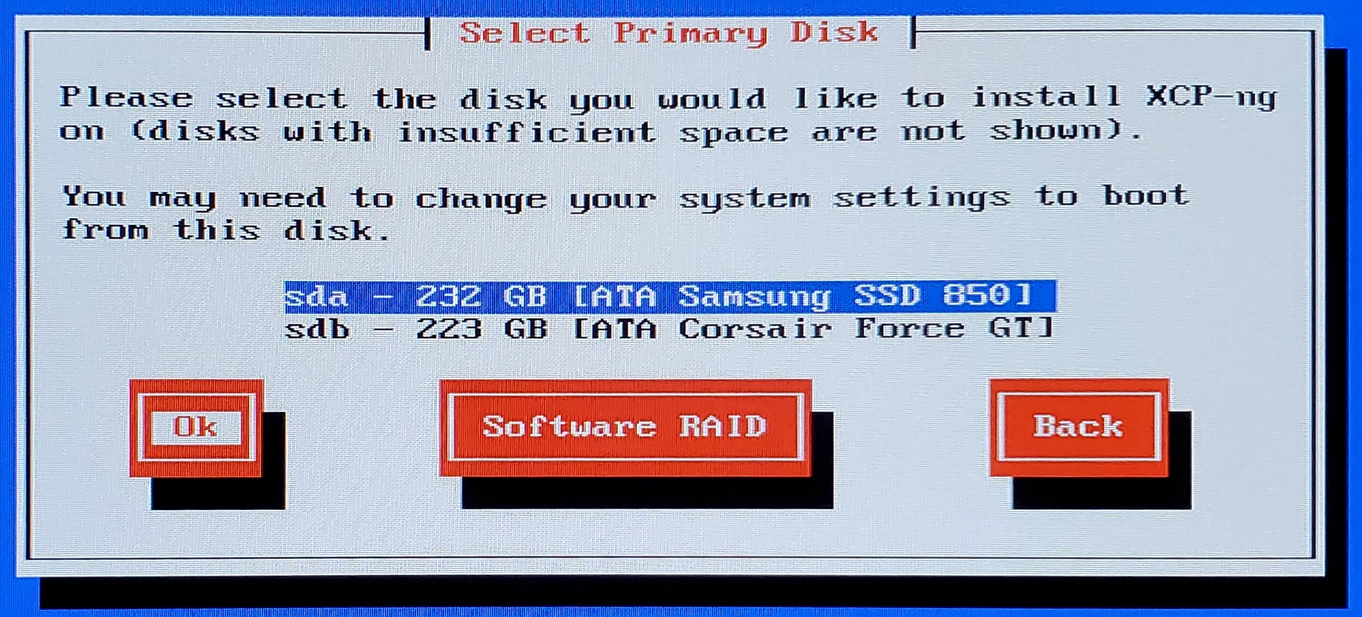 Next, select the disk your system that is the Primary disk. This will also be the disk that XCP-ng will boot off of. Here, I have 2 disks, a Samsung SSD and a Corsair SSD. For my machine, I need to select the Samsung disk.