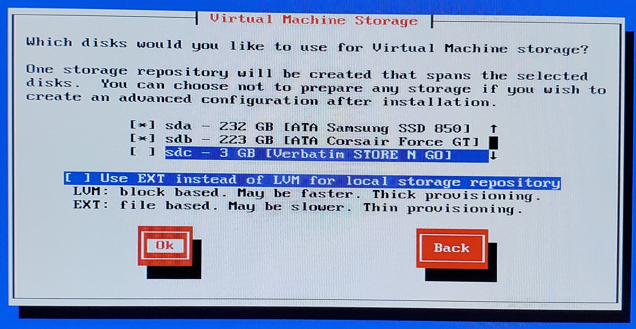 Here we will select any disk(s) that you want to use to store your virtual machines. If you have one disk in your system, you will see just the one disk along with your XCP-ng install media. Again, I have 2 SSDs on my machine and I am going to choose to have the storage of my virtual machines run across both drives. I am also going to stay with LVM for my drives, so I will not be selecting the “Use EXT” option.