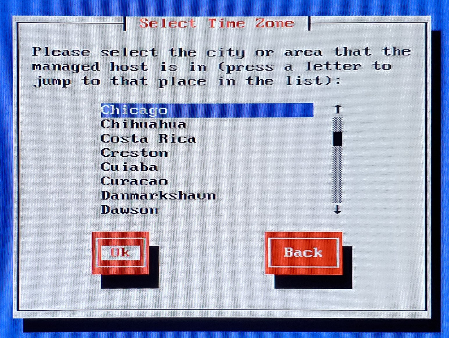 Geographical Area and Time zone. For geo-location, I chose “America” and the next screen will ask you for a city that is close to you in order to set a more exact time zone. Since I am in the Midwest, I chose “Chicago”.