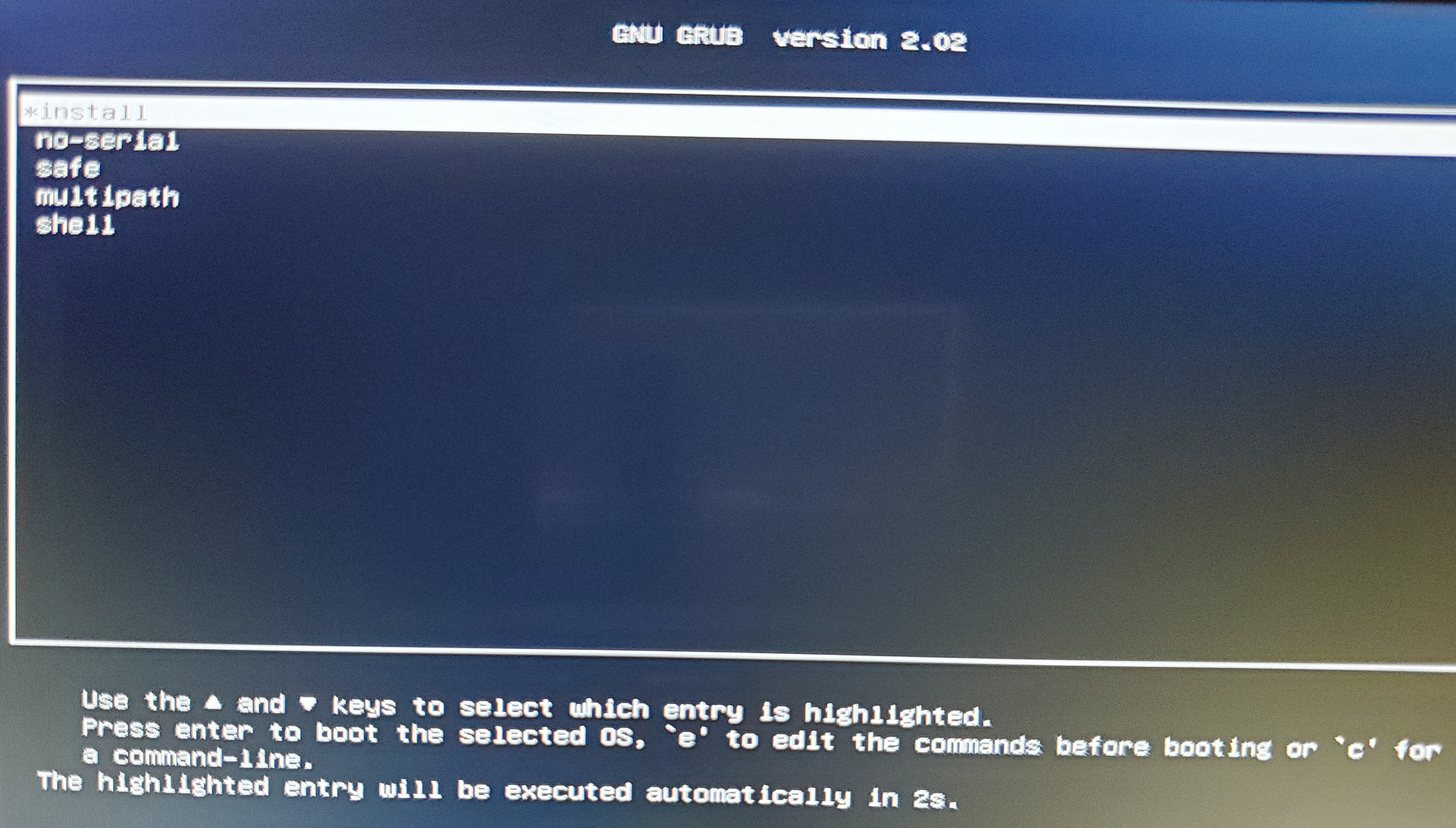 I have gone ahead and plugged my USB stick into my server, booted the server and chose the USB as my boot device. When the server boots from you boot media, you will see this GRUB menu. You can choose *install or wait a couple of seconds and the installation process will start.