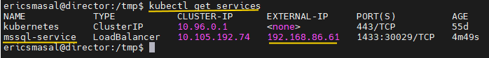 Use the get services command and look for our service named ‘mssql-service’. From what we see here, our LoadBalancer service was giving an IP address of 192.168.86.61 from MetalLB. We will use that IP address to connect to SQL Server.