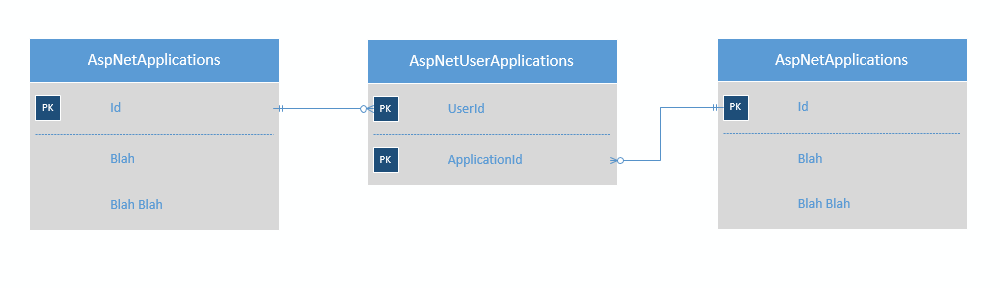 I would like to associate the new AspNetApplications table to the users table. If I want a user to be allowed access to multiple Applications and I want Applications to be assigned to many users, I have a Many-To-Many relationship. Now I can’t just associate my Applications table and my Users table directly. The Normal Form police will come knocking at my door.