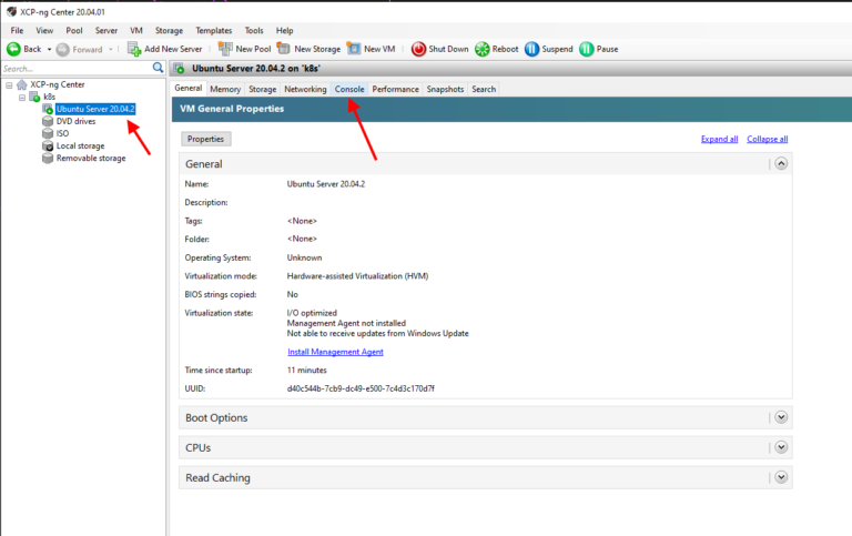 After the creation is complete, we will see our new VM listed under our server in the XCP-ng Center application. From here, go to the virtual machine’s console by selecting the Console tab.