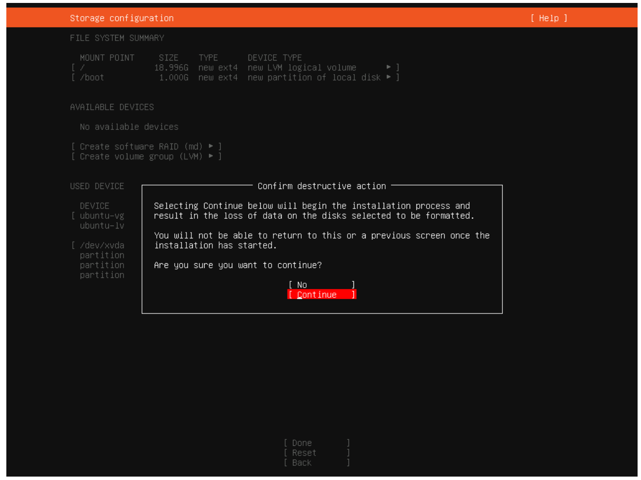 The install will ask you if you are OK with this reformatting your disk. Unless you have any changes to make, select the “Continue” option.