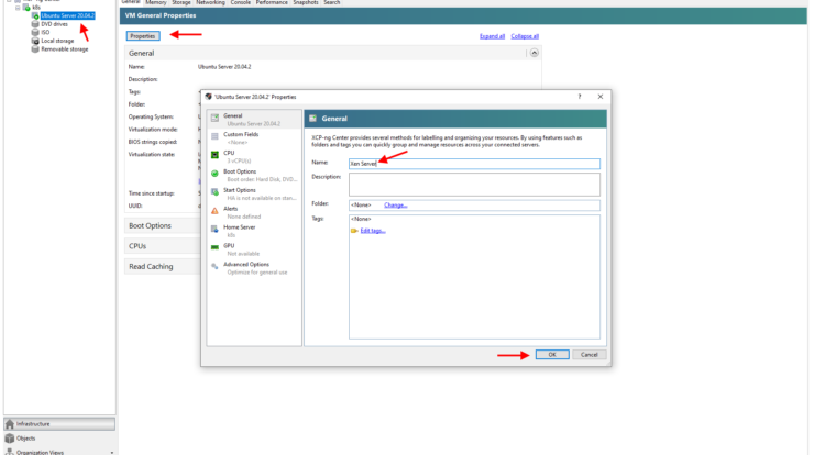 Here is where I renamed the virtual machine from the Ubuntu Server version to a name more suited to what our VM will be doing. I decided to name this virtual machine “Xen Server”.