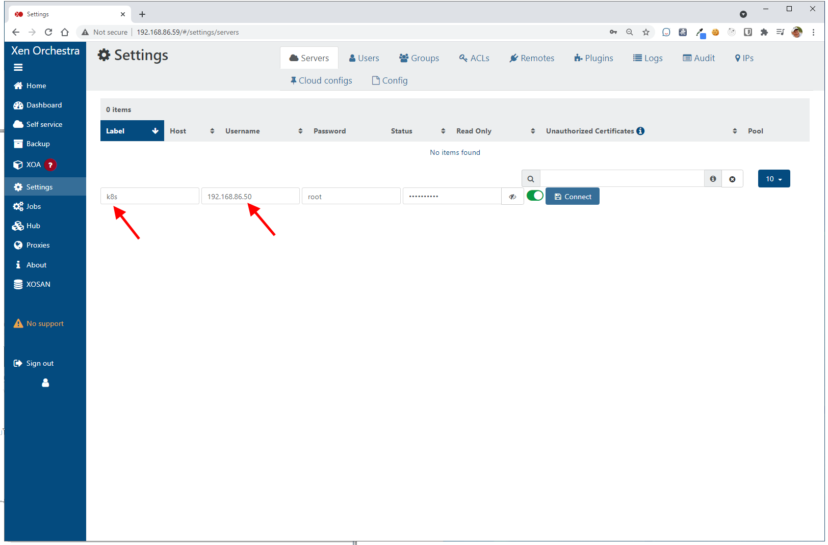Click the “Add server” here in order for Xen Orchestra to look to our XCP-ng server where our Virtual Machines will run.