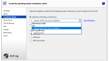 The following step, we choose that we will install our OS from our ISO library that we created in our last post. In the dropdown, you can see our Ubuntu Server ISO file that we also uploaded to our XCP-ng server. Go ahead and choose this ISO.