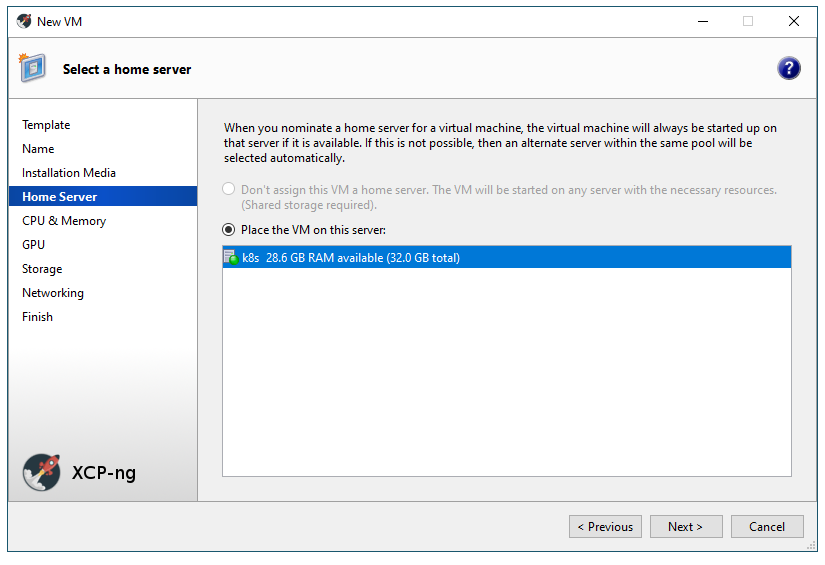 For our Home Server selection, you can see that our XCP-ng server named “k8s” is selected for us.