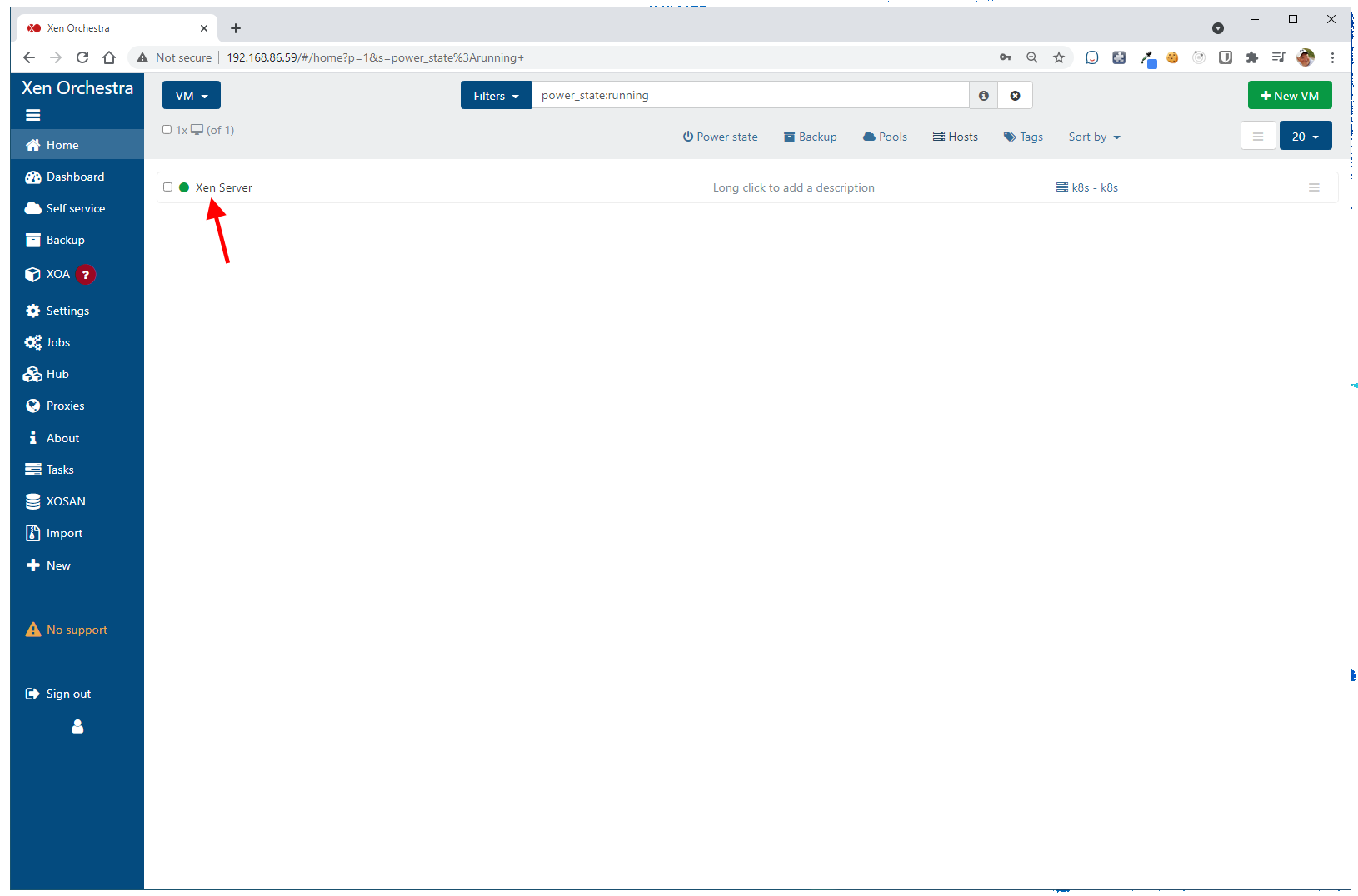 After connecting to our server and updating the pools, go back to the Home button and after you click it, you will see the Xen Server VM that we created earlier using XCP-ng Center. This is the VM that our Xen Orchestra website is running from!