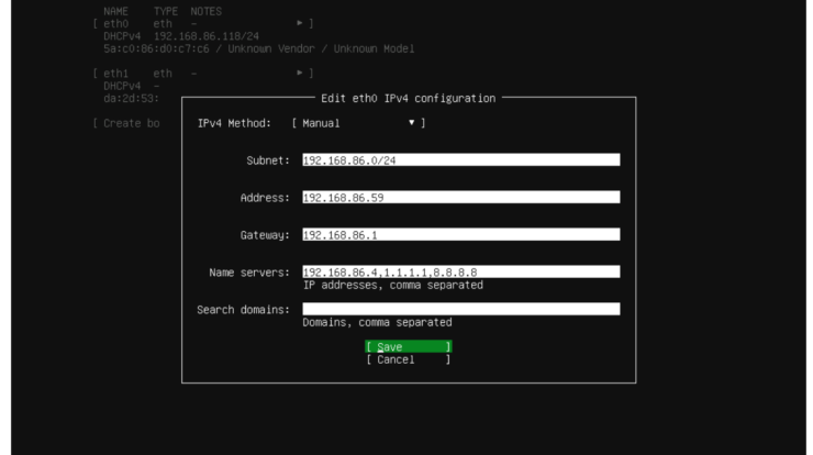 I have set this Xen Orchestra server to the 192.168.86.59 IP address. For the Name Servers (DNS servers), I have chosen my local DNS server as the initial lookup sever. I have then subsequently added Cloudflare and Google DNS servers.