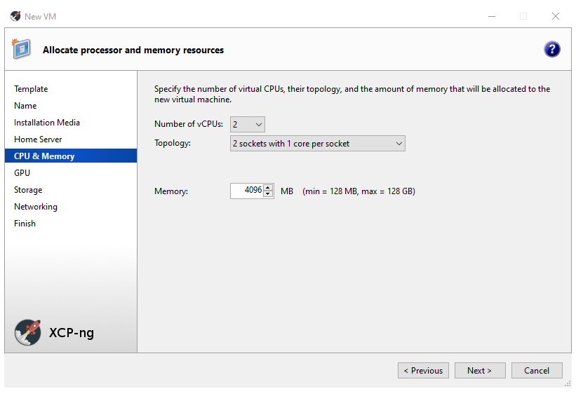 In this step, I have chosen to give my VM 2 CPU’s and 4gbof memory. My server has 32gb of available memory.