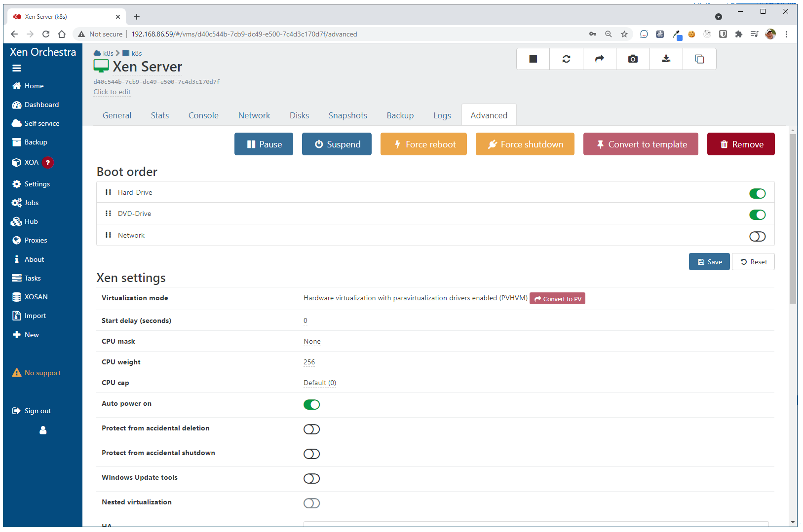 Because we will rely on using Xen Orchestra moving forward, click on the Xen Server shown in the above image. We will now be brought into the details of our Xen Server VM. Then, on the Advanced tab, make sure the “Auto power on” is selected. This will start up the Xen Server VM when the XCP-ng server boots.