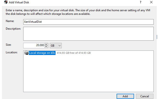 Let’s name our VM’s disk “XenVirtualDisk”. Then, depending on how much storage you have available to you, set the size that you would like for your disk. I doubt that Xen Server will need a huge amount of disk space so I decided to allocate 20gb for this disk. Click on “Add” here to get back to the Storage step and you will see the details of your new disk. Also note that I did not check the “Use storage-level fast disk clone”.
