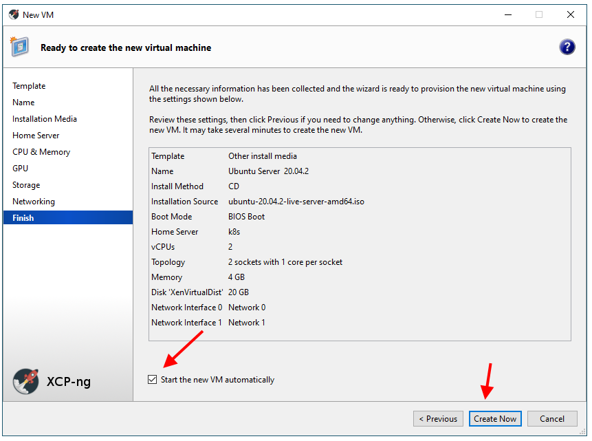 And here we are! Select the option to have the VM start automatically and hit the “Create Now” button.
