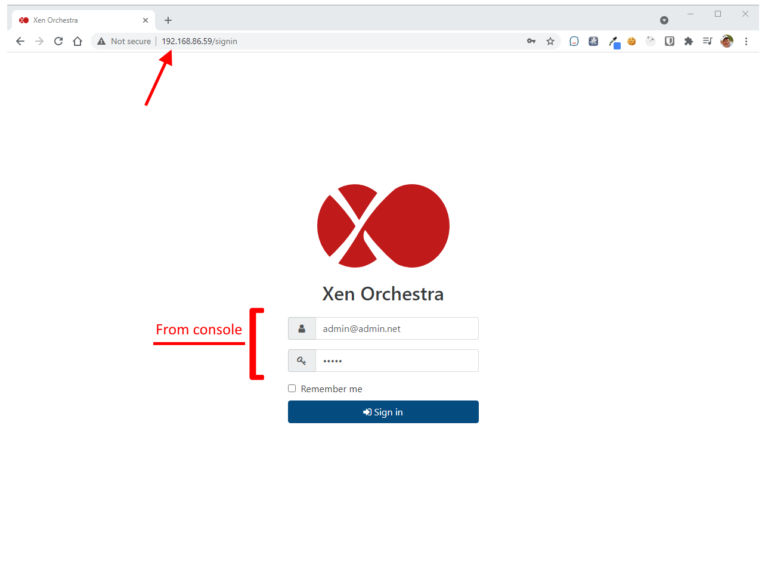 Open up a browser now and enter the IP address of the Xen Server VM into the address bar and you should be taken to the Xen Orchestra Homepage.