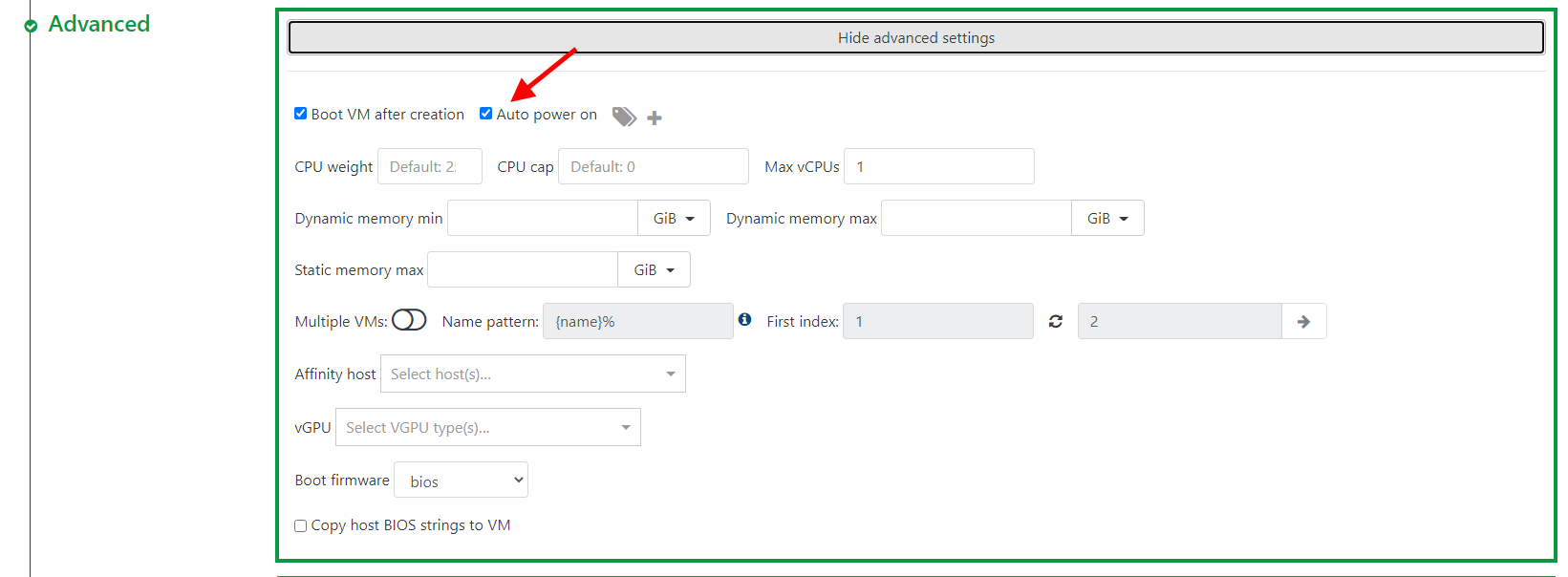 Here in the Advanced block, I just checked the “Auto power on” selection so that the server will boot every time the host starts up.